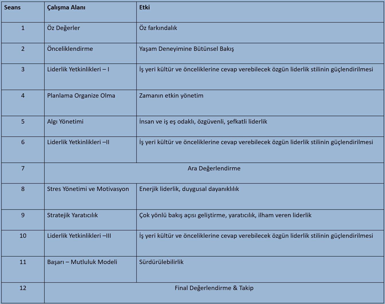 Kadın Liderler Gelişim Programı, kişinin yaşam amaç ve kariyer hedeflerine yönelik mentörlük ve koçluk disiplinlerinin birbirinden bağımsız ve bir bütünlük içinde uygulandığı süreçlerinden oluşuyor. Kişinin mutluluk ve başarı ideallerine hizmet eden bu program, ile liderliğin güçlenmesi, davranışlarda olumlu ve kalıcı dönüşümler hedefleniyor.